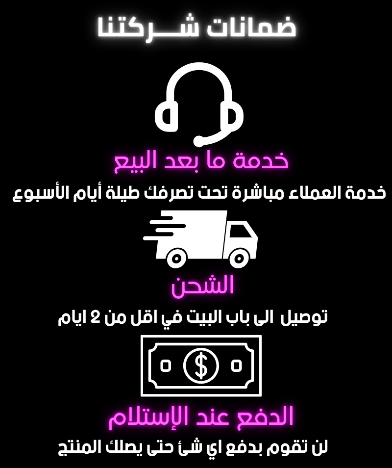 شحن سريع (24 ساعة / 72 ساعة) : 7.000 د.ت خدمة العملاء متاحة كامل أيام الاسبوع. امكانية تبديل المنتج في حال وجود خلل. الدفع عند الاستلام. إمكانية فتح الطرد والتحقق من المنتج قبل الدفع.